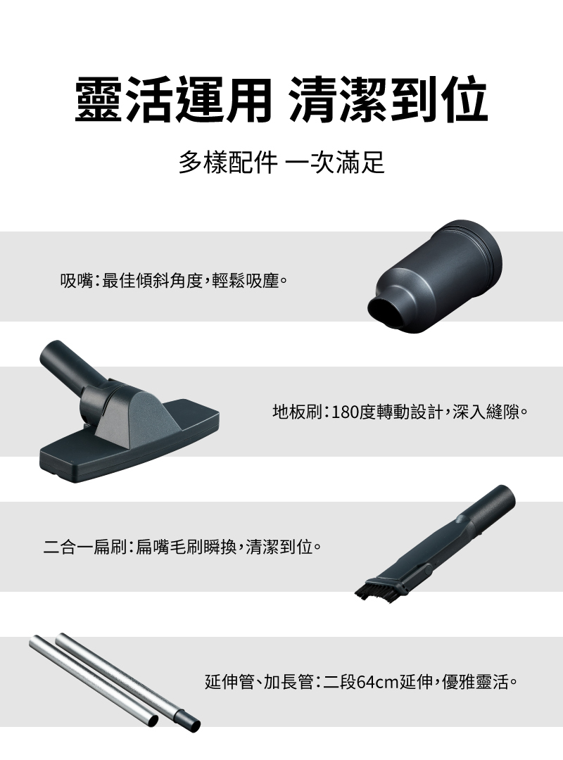 無限吸塵器主機、吸嘴*1、地板刷*1、二合一扁刷*1、延伸管*1、加長管*1