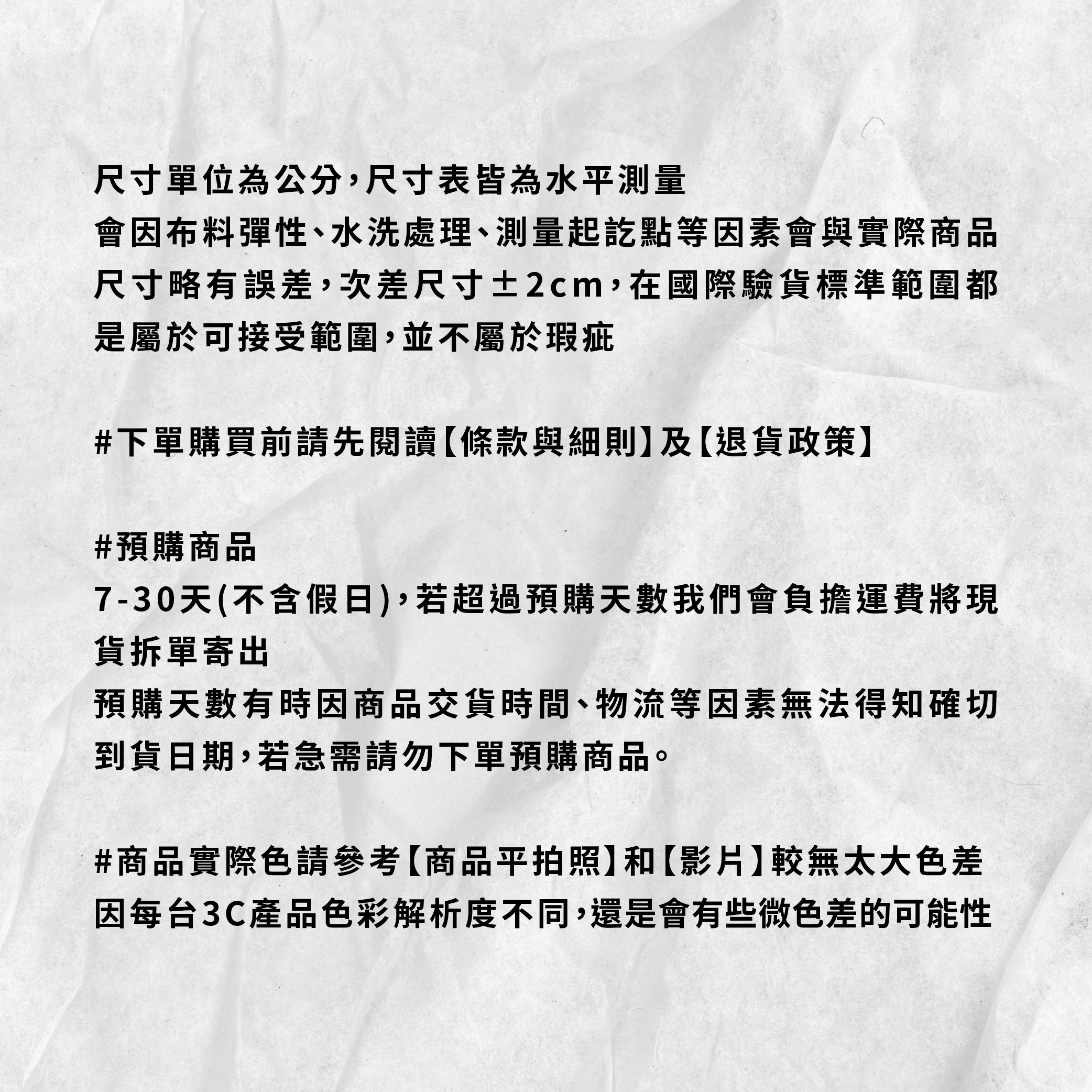 📍預購商品7-30天(不含假日),若超過預購天數我們會負擔運費將現貨拆單寄出預購天數有時因商品交貨時間、物流等因素無法得知確切到貨日期,若急需請勿下單預購商品。